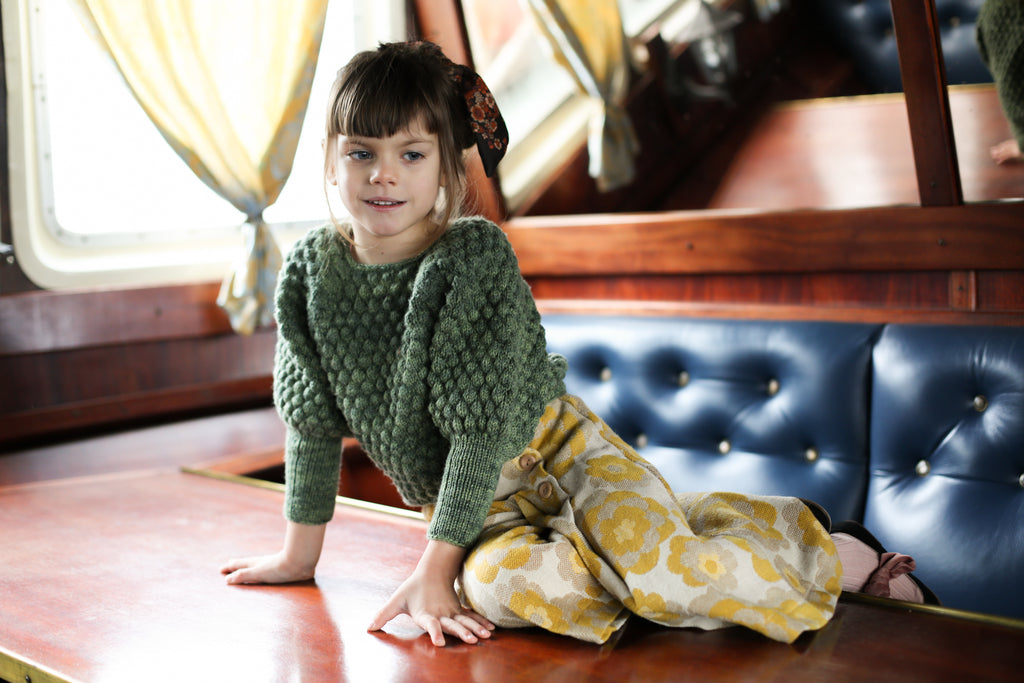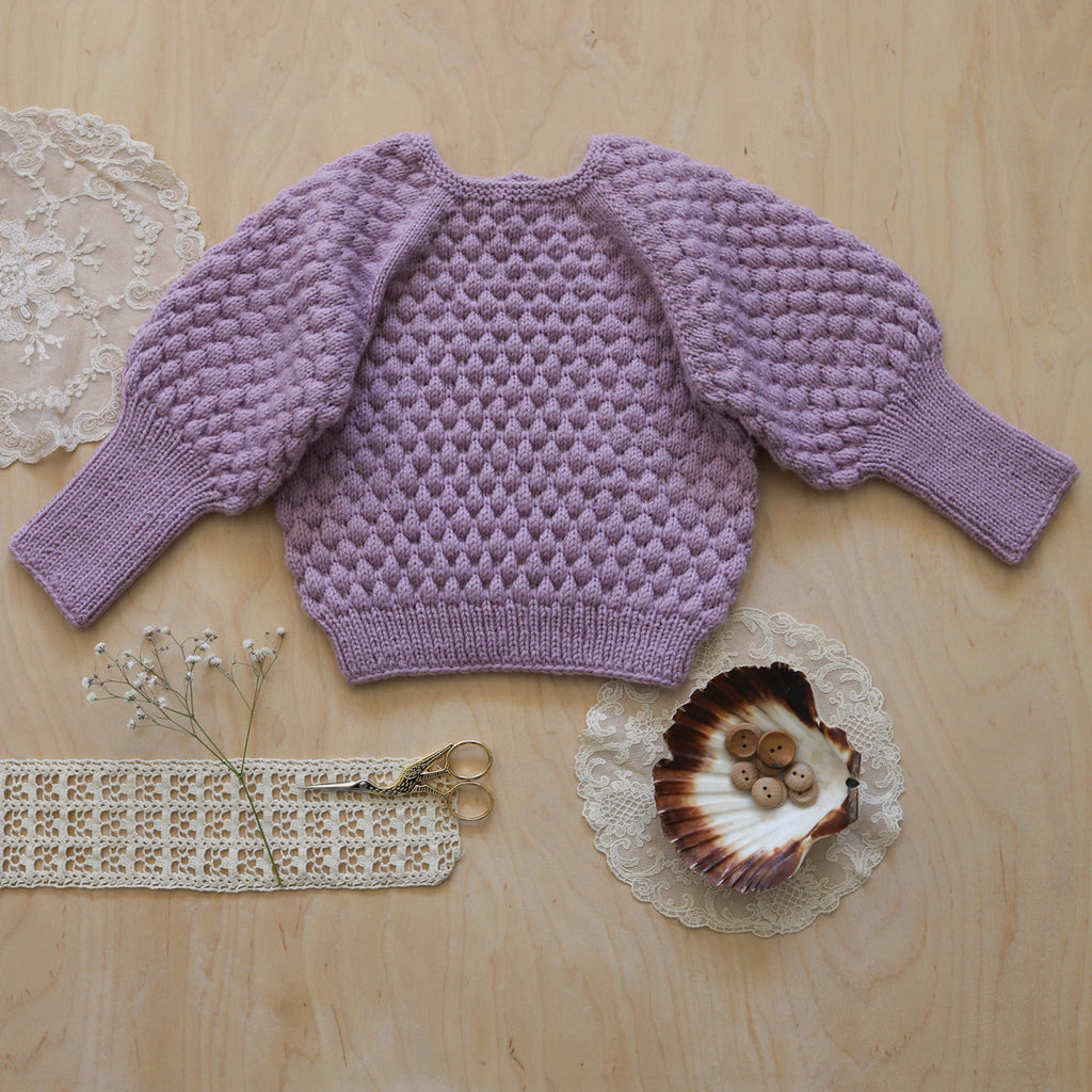 The Elissa sweater is a fun children’s sweater with an all-over bubble pattern and ribbed trim. This sweater is worked from the top down. The neck is worked flat and then the stitches are joined to work in the round. Following a yoke increase section, the sleeves are separated from the body and put on hold while the remainder of the body is worked. Then the sleeves are worked last.