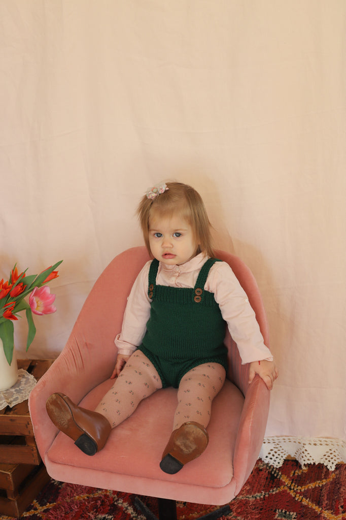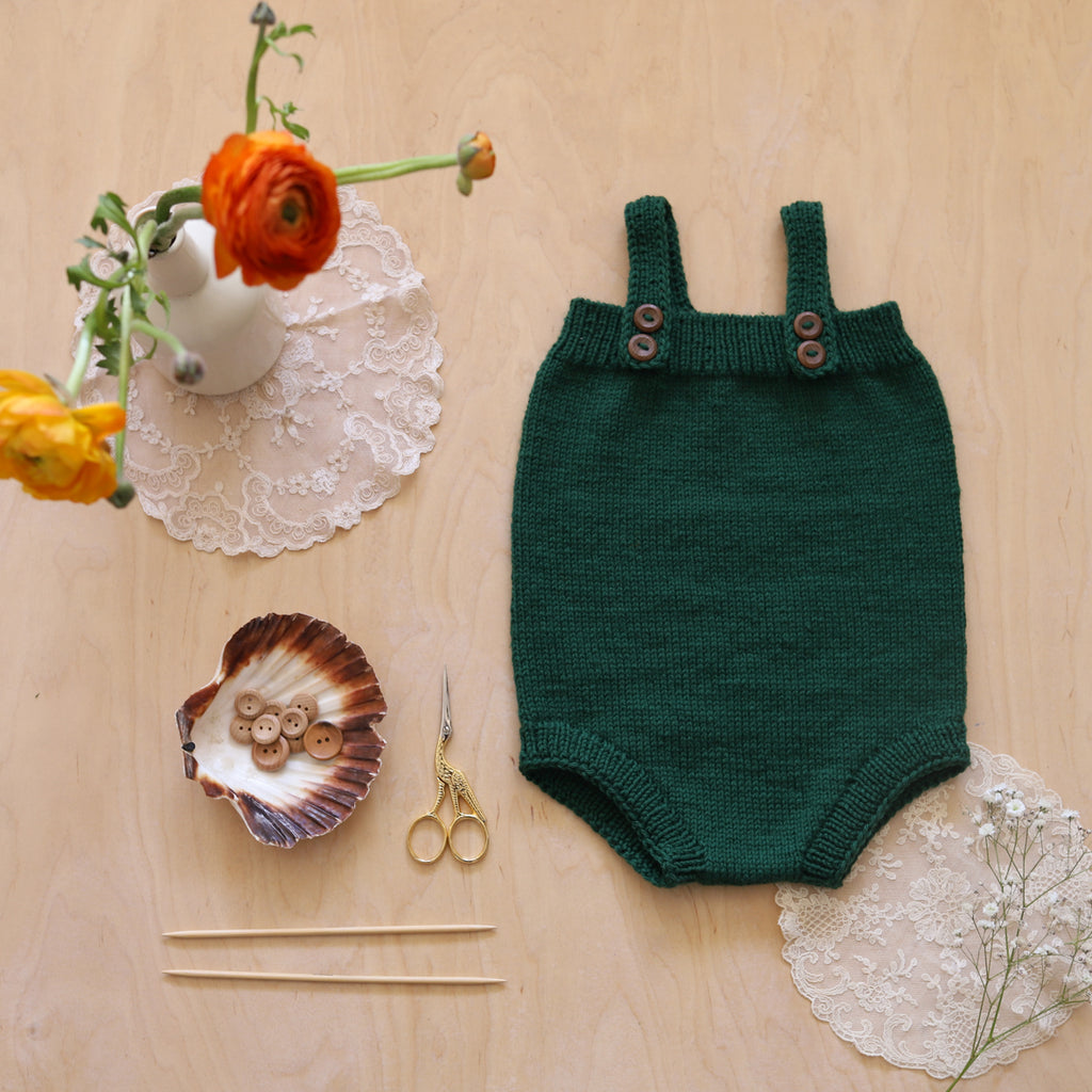 Simple but practical romper with straps and four buttons at front. Comfortable cut. Knitted in worsted merino wool in the rounds from top to bottom.
